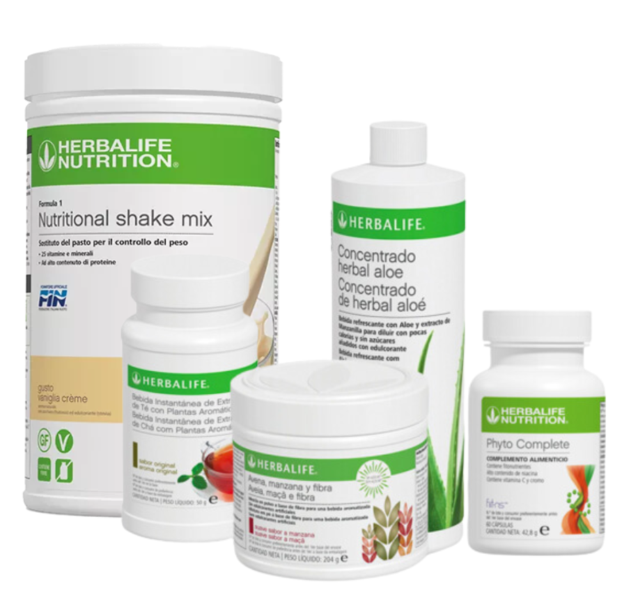 El pack contiene 5 productos: una bebida de aloe vera, bebida de extracto de té, una bebida de avena manzana y fibra y el complemento alimenticio Phyto Complete y un batido de 550 gramos.